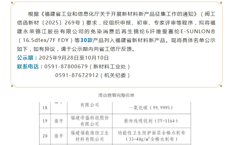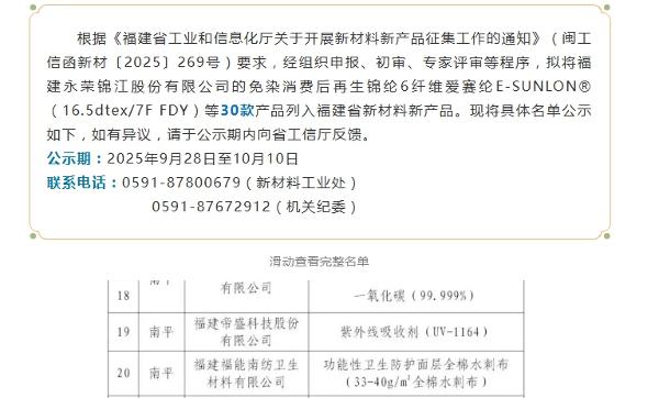 近日,福建省工信廳發(fā)布《2025 年福建省新材料新產(chǎn)品公示名單》,公司自主研發(fā)的功能性衛(wèi)生防護(hù)面層全棉水刺布(33-40g/m2)成功入選。