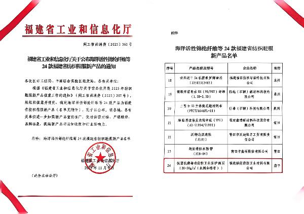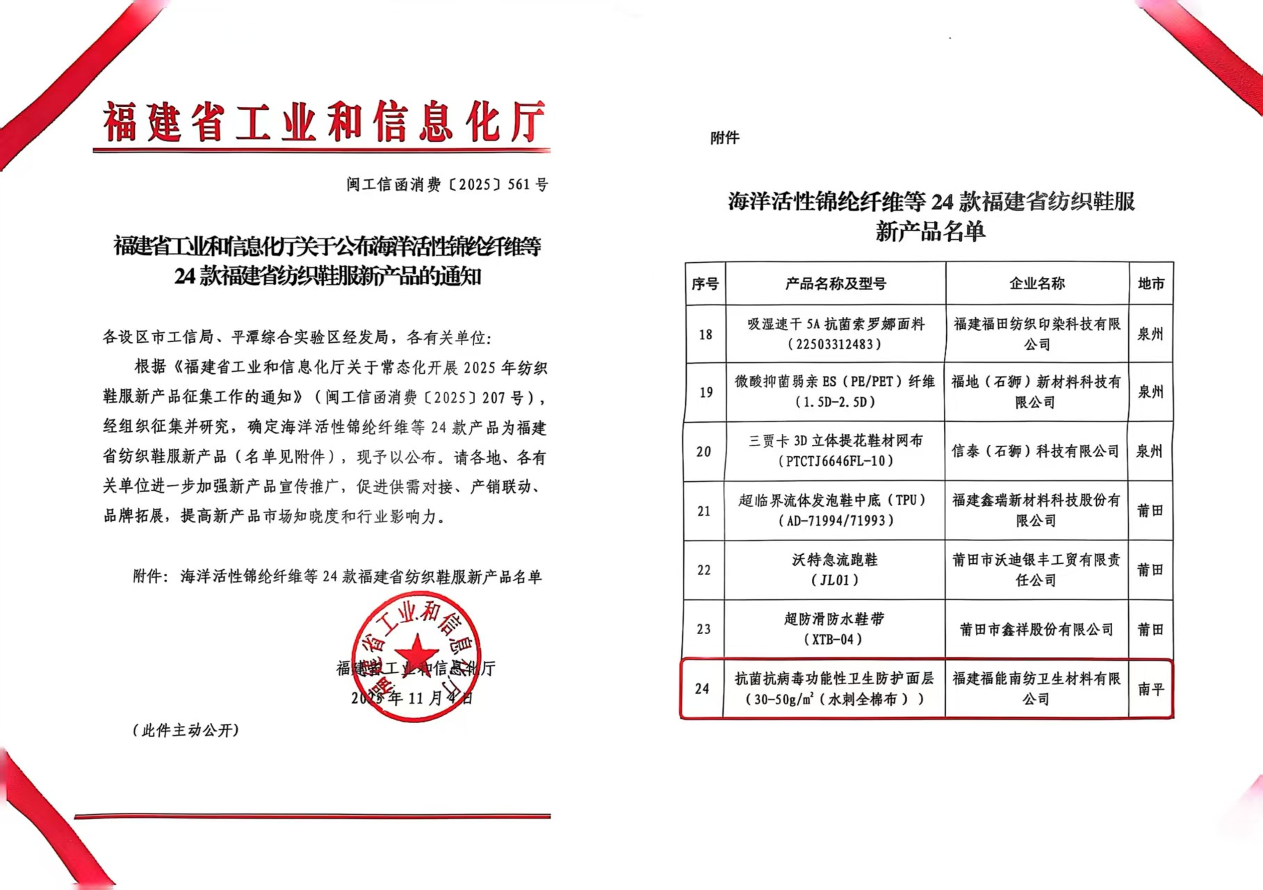 近日,公司1項(xiàng)新產(chǎn)品“抗菌抗病毒功能性衛(wèi)生防護(hù)面層(30-50克(水刺全棉布))”經(jīng)省工信廳組織專(zhuān)家審核、線上答辯等程序獲得通過(guò),成功列入2025年福建省紡織鞋服新產(chǎn)品(第二批),是南平市唯一獲得通過(guò)的企業(yè)。