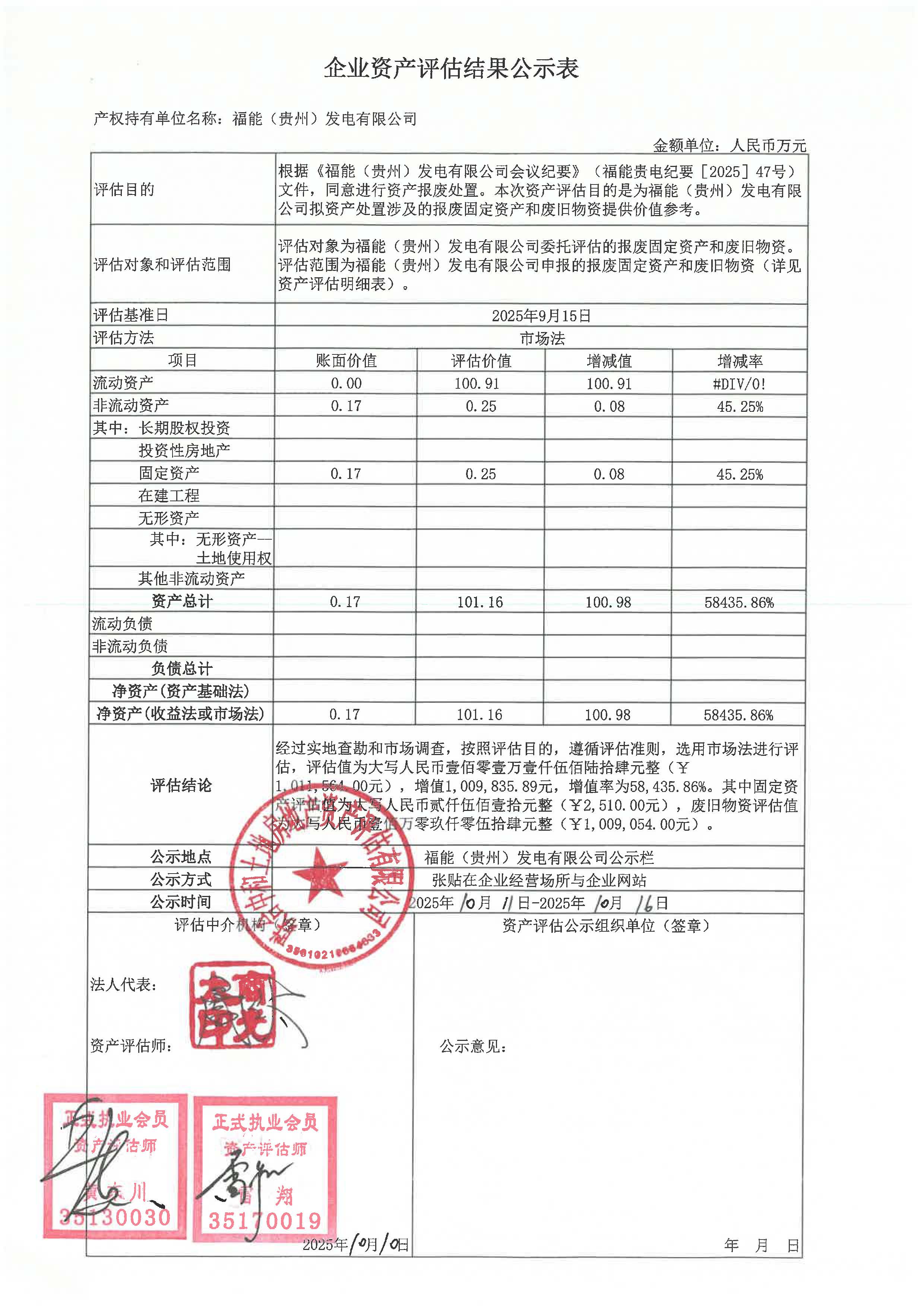根據(jù)《福建省能源石化集團(tuán)有限責(zé)任公司國有資產(chǎn)交易管理辦法》規(guī)定,現(xiàn)將福能(貴州)發(fā)電有限公司《企業(yè)資產(chǎn)評估結(jié)果公示表》進(jìn)行公示,詳見下表。